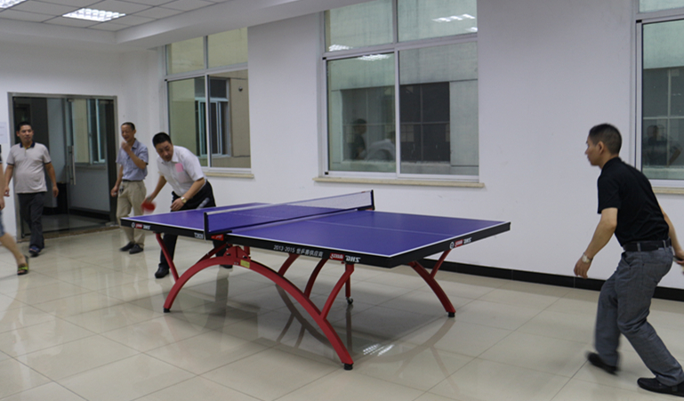喜乐会的内容较为丰富:晚宴开始之前,公司总经理李栋梁和生产部的一线员工,来到企业活动区,展开了乒乓球的角逐。大家你来我往,加油声此起彼伏。